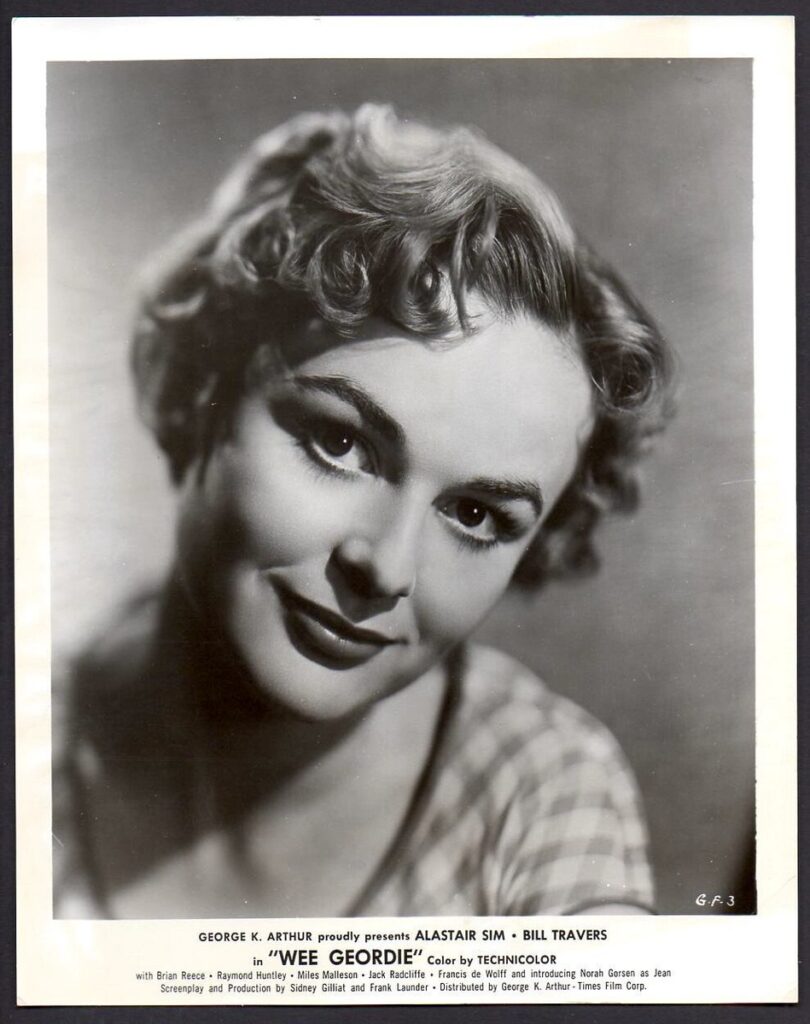 Norah Gorsen was Bill Traver’s leading lady in “Geordie” in 1955. She was born in Poole, Dorset in 1933. Her only other film seems to be “Personal Affair” with Gene Tierney and Glynis Johns. She featured on television until 1969. She was married at one time to actor Ronald Lewis.