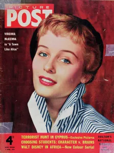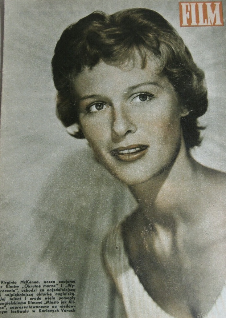 Virginia made her cinematic debut with a prominent role in The Second Mrs. Tanqueray (1952) starring Hugh Sinclair and Pamela Brown, then played Richard Attenborough’s sister-in-law in Father’s Doing Fine (1952). Two more films arrived the following year with The Oracle (1953) starring Robert Beatty and the Oscar-nominated WWII drama The Cruel Sea (1953) with Jack Hawkins, Donald Sinden, Stanley Baker and Denholm Elliott, the last mentioned to whom she later married in 1954. Following classical stage parts in “Richard II,” “Love’s Labour’s Lost,” “Henry IV” and “As You Like It” at the Old Vic during its 1954-1955 season and her acclaimed BAFTA-winning role as Juliet opposite Tony Britton’s Romeo in a BBC-TV version of “Romeo and Juliet,” Virginia returned to filming with Simba (1955) starring Dirk Bogarde and The Ship That Died of Shame (1955), another WWII drama that reunited her with Richard Attenborough. Film stardom came with her crop-haired role as WWII Japanese captive Jean Paget in A Town Like Alice (1956) opposite Peter Finch. Both actors won BAFTA film awards for their roles. As such Virginia grew in box-office status.
