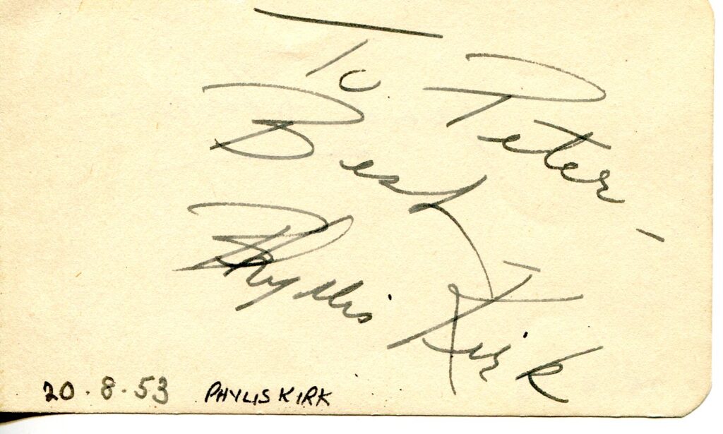 Kirk then became one of those American stars used to boost British product, starring opposite John Bentley in River Beat (1954), a superior “B” movie and an impressive directorial début by Guy Green, who stated, “Phyllis Kirk was an up-and-coming actress who never became a major star, but she was a very bright, nice girl, whom I was lucky to have.” Kirk recalled,