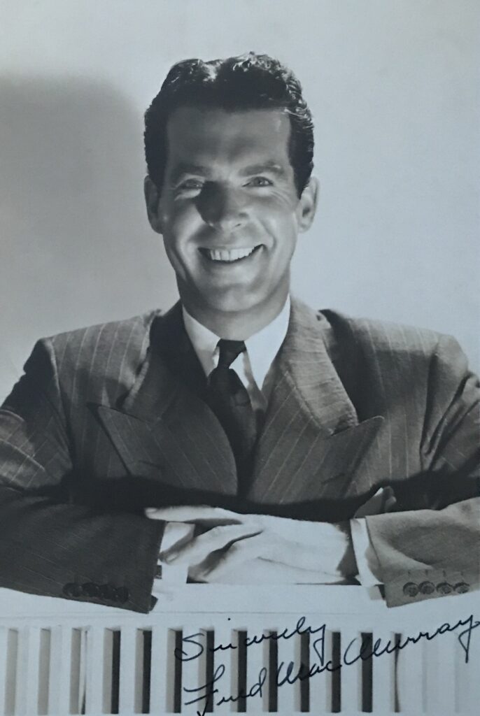 MacMurray earned a full scholarship to attend Carroll College in Waukesha, Wisconsin and had ambitions to become a musician. In college, MacMurray participated in numerous local bands, playing the saxophone. In 1930, he played saxophone in the Gus Arnheim and his Coconut Grove Orchestra when Bing Crosby was the lead vocalist and Russ Columbo was in the violin section. MacMurray recorded a vocal with Arnheim’s orchestra “All I Want Is Just One Girl” — Victor 22384, 3/20/30. He appeared on Broadway in the 1930 hit production of “Three’s a Crowd” starring Sydney Greenstreet, Clifton Webb and Libby Holman. He next worked alongside Bob Hope in the 1933 production of “Roberta” before he signed on with Paramount Pictures in 1934 for the then-standard 7-year contract (the hit show made Bob Hope a star and he was also signed by Paramount). MacMurray married Lillian Lamont (D: June 22, 1953) on June 20, 1936, and they adopted two children.